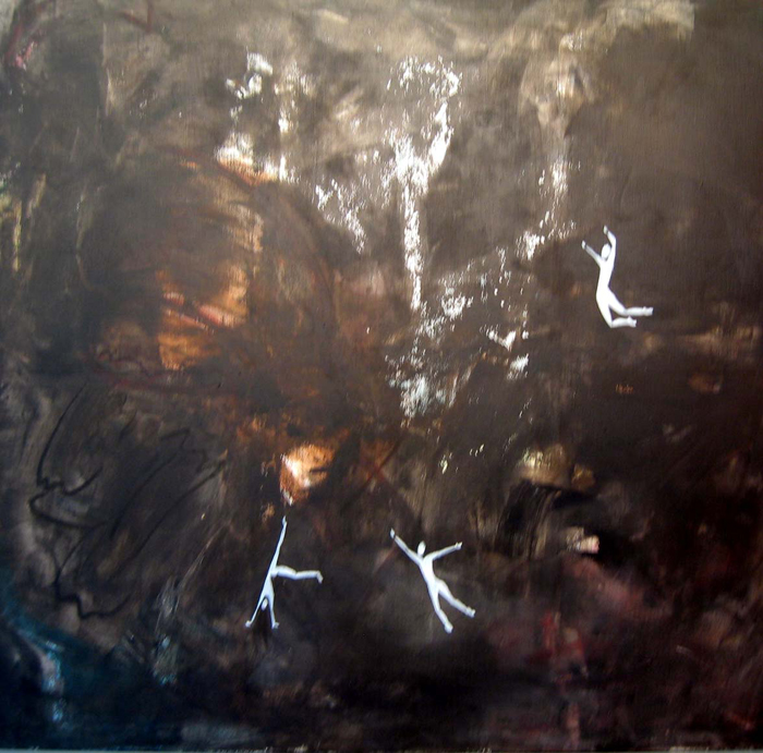 1.untitled, mixed media 2.bonhomme planant acrylic 130x100 cm. 3.arbre genealogique, mixed media 4.untitled, mixed media 5.Le grand saut, 2008 130x130 cm, euro 3500 6.Bonhommes blancs, 2005 130x100 cm. euro 3200