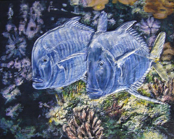 poissons lune, acrylic painting with mortar and relief effect 50 x 40