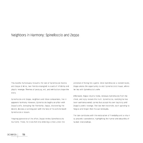 playful revenge. Themes of jealousy, wit, and retribution shape the he lies with Spinelloccio’s wife.